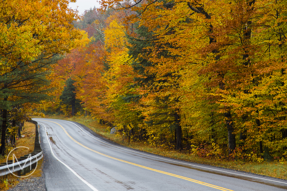 North Conway came as a discovery to me. Initially we were supposed to spend the night in Portland (and had a motel booked, which we had to cancel, free of charge luckily), but as plans shifted I realized that we had a short drive one day, and a really long one the next, so a town in the middle had to be found. Once we discovered the outlet mall in North Conway we knew it was the perfect place to sleep in.I woke up and got dressed before the rest of my group and made a walk around the neighborhood. The fall colors here were really intense. Nothing here has been edited. This is the intense orange and yellow color I mostly saw while walking around. It was a bit misty, but I think it added a lot to the images
